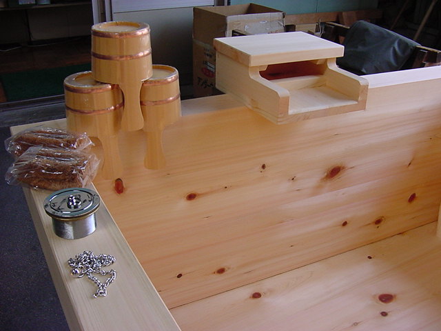 no metal faucet for this hinoki ofuro: the piping is hidden inside the wood spout