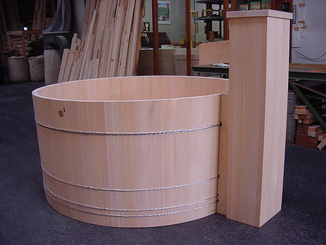 This wooden tub is equipped with a floor mounted spout. This has to match the slanted/curved edge of the circular tub. The "waterfall" balances the composition and add to the relaxing effect of japanese style bathing.