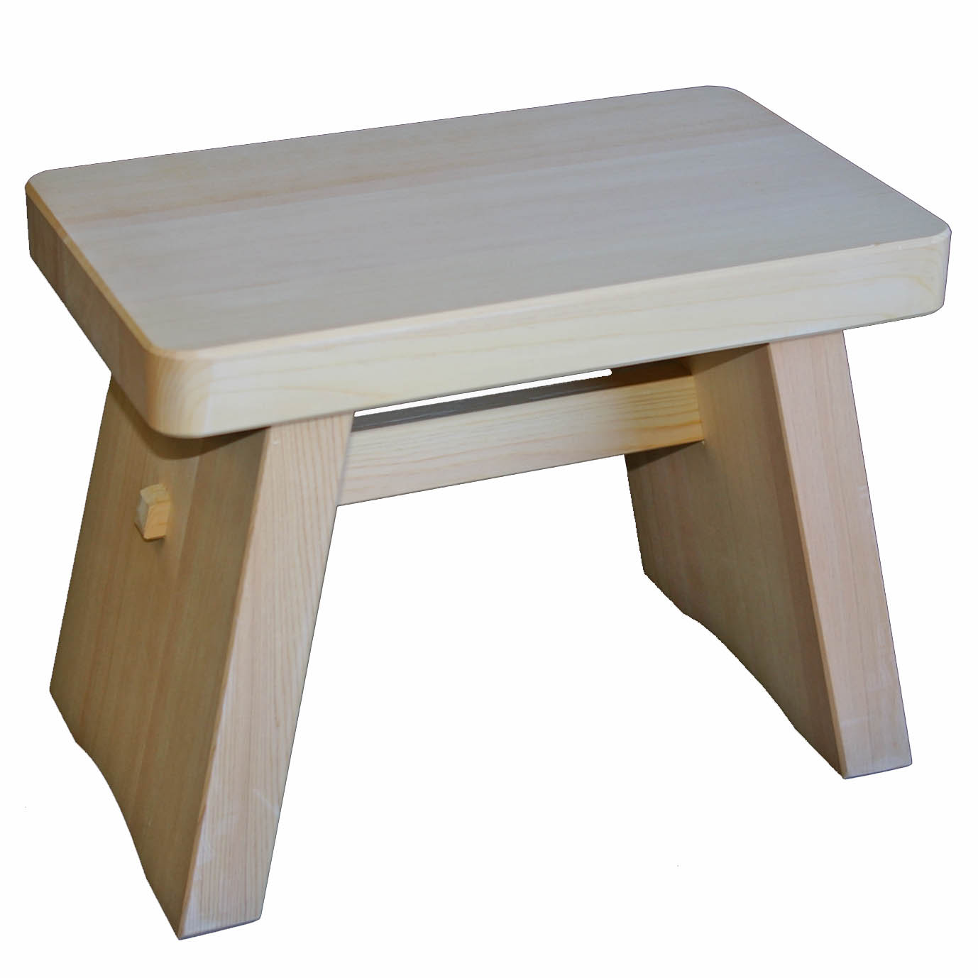 You’ll find a small stool (風呂いす) like this in every Japanese bathroom, often made from plastic, but traditionally made from wood like this one. These are usually purchased together with a bucket. For just a hint of Japanese minimalism in your bathroom, these are a great accent. As the custom is to shower before getting into the ofuro, this stool and the bucket are placed next to the tub, where the shower is located. The bather uses the shower and the running water from the faucet to wash body and hair, while seated. The bucket is filled with water to splash and rinse the body. There’s usually a mirror, quite low to the floor, so that when seated the bather can see what he or she is doing. Some people even shave while seated here. Have you tried sitting to shower? It’s a lovely relaxing experience, quite different from the quick rinse of the typical western shower. This stool is made from Japanese hinoki. It will release its lovely lemony scent when wet. The price includes shipping, click the drop-down menu to see the price for your location. We make this traditional stool in two sizes, this is the smaller of the two. The Large stool is wider in the seat and has longer legs.