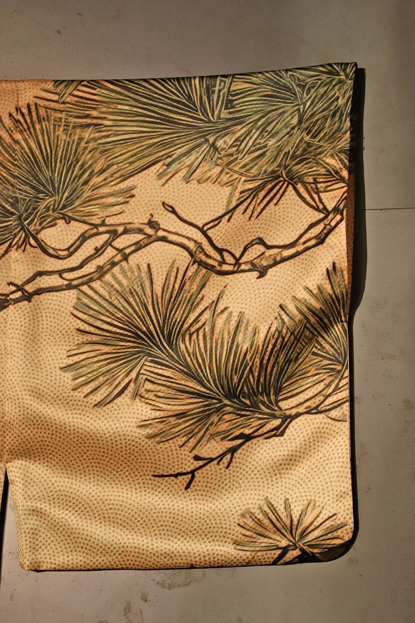 The pine tree framing the composition represents longevity, timelessness, resilience, and good fortune, as it remains green throughout the winter.